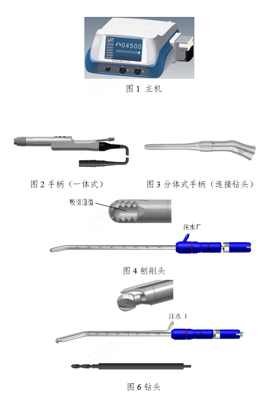 2手柄由操作者握持并驱动所夹持的工具头实现手术。手柄可为一体式或分体式。一体式手柄通常内置电机并集成传动和工具头接口部分。分体式手柄由夹持工具头的手柄和给手柄提供动力的电机两部分组成。部分产品的电机不在手柄中而内置在主机中。部分手柄带有负压吸引通道。示例见图2、图3