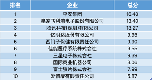 从整体来看,我国在数字医疗方面的专利不仅仅在申请量上和发明专利授权量上处于全球第一梯队,中国的企业也在全球的数字医疗的专利综合指数中占有举足轻重的地位。