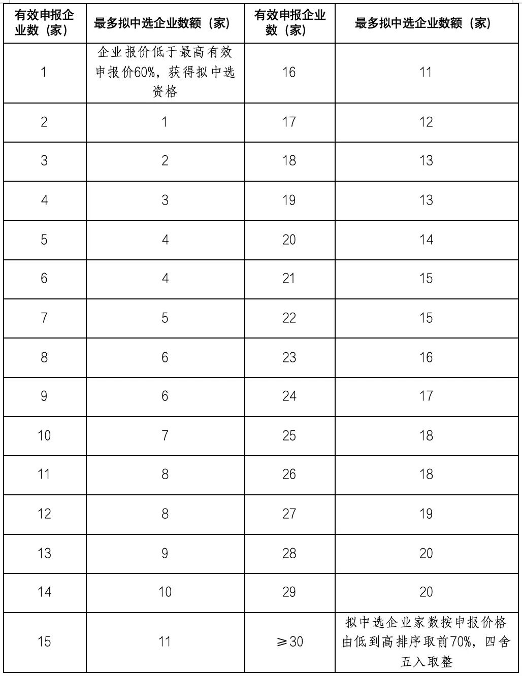 各竞价组按市场占有率分为A、B两个竞价单元,同一竞价单元内,依据申报企业报价由低到高进行排名,拟中选企业取数表如下: