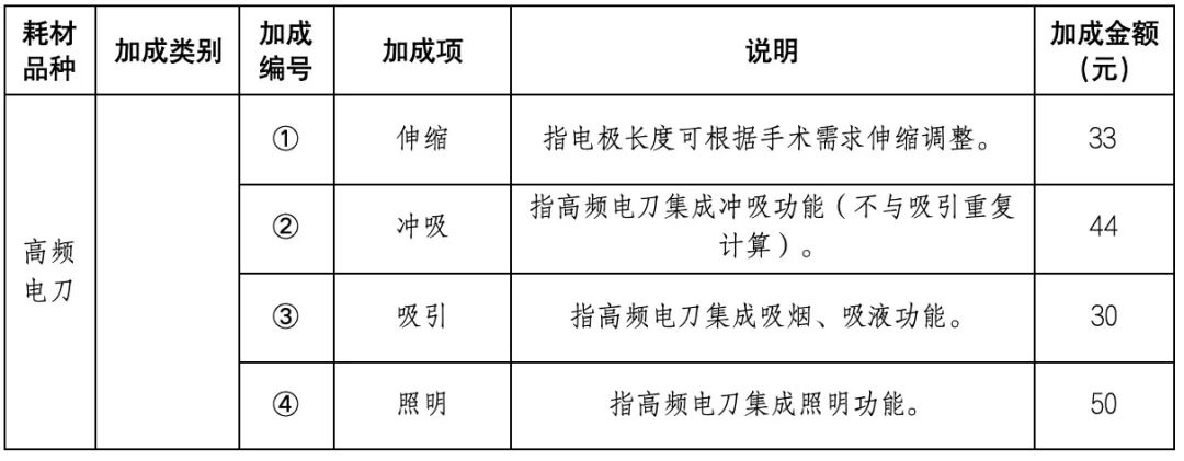 值得注意的是,本轮集采设置中选产品加成规则,伸缩、冲吸、照明、电极旋转、涂层材料等均被列入加成项,且明确了具体加成金额。根据采购文件,企业各竞价组内拟供应产品价格=基准价格+加成金额
